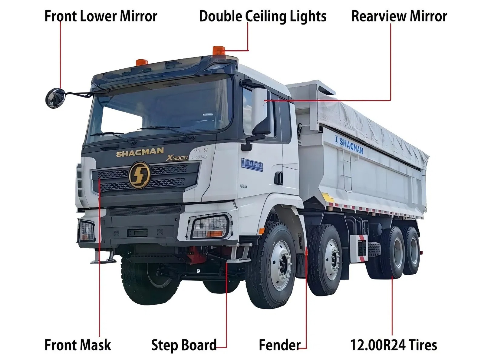 Shacman x3000 6x4 & 8x4 самосвалының кабинасы кеңейтілген жалпақ төбесі немесе орташа ұзындықпен жасалған, ені 2490 мм, ал ені 2490 мм құрайды, ал рұқсат етілген тұрғындар саны 2, кең және жайлы жүргізеді. Жанармай багы алюминий қорытпасынан жасалған, қуаттылығы 300L-ден 600L-ге дейін, қалааралық көлікті жанармаймен қамтамасыз етуді қамтамасыз етеді. Алдыңғы осьтің рұқсат етілген жүктемесі 6500 кг немесе 7000 кг, ал артқы осьтің рұқсат етілген жүктемесі - 18000 кг (2-білік тобы), ал жылдамдық коэффициенті 5,26-дан 5.92-ге дейін, бұл қуатты беру және бейімделуді қамтамасыз етеді. Жүк бөлімдері жұмыс кезінде тәуекелді азайту және қызмет ету мерзімін ұлғайту үшін дәнекерленген. Сонымен қатар, Shacman x3000 6x4 & 8x4 самосвалдары ABS-тің қауіпсіздікке қарсы тежеу жүйесі, мысалы, қозғалыс қауіпсіздігі және FCWS соқтығысу жүйесі және FCWS соқтығысу жүйесі.